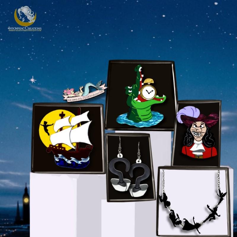 Each order will include: Tic Toc Brooch, Captain Hook Brooch, Captain Hook Earrings, Peter Pan Theme Brooch, Peter Pan Silhouette Necklace and the Mermaid Pin
