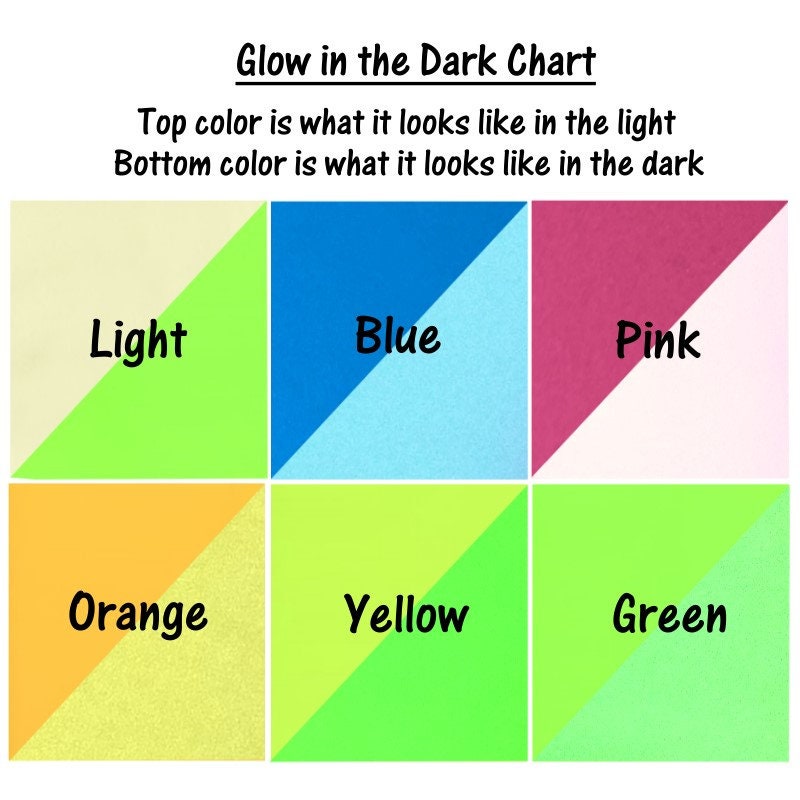 Glow in the dark option are: Light (as pictured in first photo), Pink, Blue, Green, Yellow and Orange
